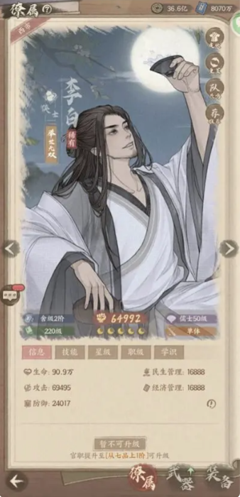 这边以李白为例,我们可以通过升级,升星,提升技能等级,提升职级等级,提升学识等级,武器,装备等来强化自己的角色,等级和职级尽量能拉满就拉满,一般都不会有太大问题,武器和装备优先提升自己的主c和前排的两个肉盾。