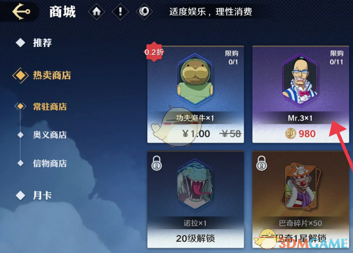 2、在商城内点击左侧的常驻商店,找到Mr.3碎片进行购买;