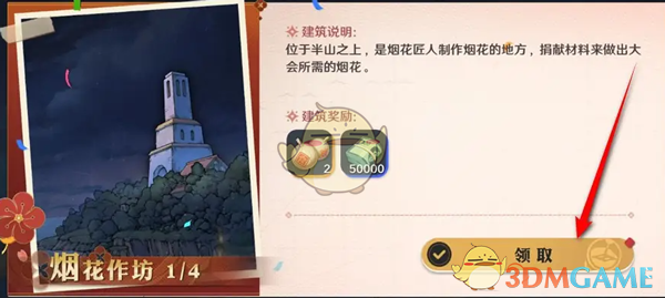 3、接着在烟花作坊页面,点击右下角的领取,就能领取活动相关的奖励;