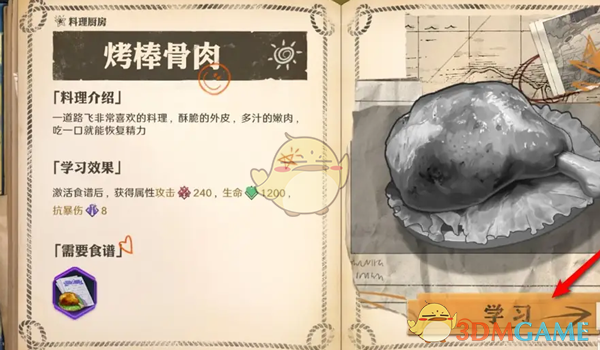 答:在厨房内点击食谱,找到烤棒骨食谱进行学习后即可前往制作。