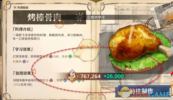 4、点击学习后,等待片刻即可完成食谱的学习,学习完成即可解锁制作;