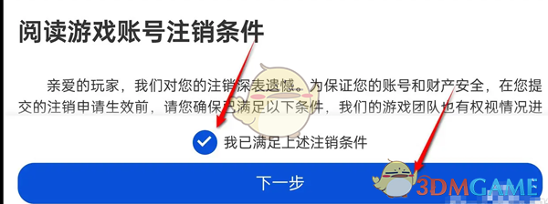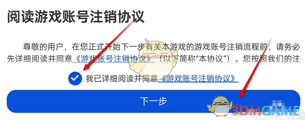 4、继续勾选游戏账号注销协议,点击下一步;