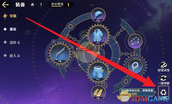 答:进入装备页面,点击分解,选择装备进行分解。