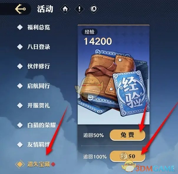 答:前往遗失宝藏活动页面,选择追回50/100%,即可追回经验。
