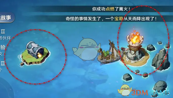 3、将篝火点燃后,即可在左侧看到一个从天而降的银色宝箱;