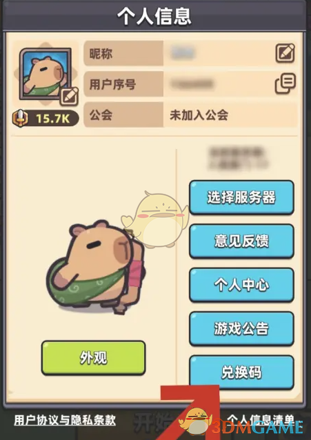 2、进入到个人信息页面,在靠右下角的位置即可看到兑换码入口,点击进入。