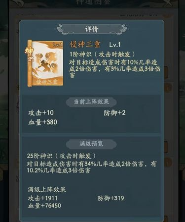 这套搭配当中核心就是法相天地+侵神三重了,法相天地的技能伤害虽然不算高,但是攻击之后是能够提高自身25%暴击以及30%爆伤的,这个加成还是非常强力的,是全游戏中为数不多能够增加暴击伤害的途径了,而侵神三重才是重头戏,这是暴击流玩家的毕业神识神通,效果就是造成伤害的时候,有10%的概率造成双倍伤害,还有3%的概率造成三倍伤害,如果运气好,在触发暴击的时候又触发了三倍伤害,那么是极有可能一个普攻就将敌方秒杀的,一共加成下来就是6-7倍的伤害,强度还是很高的。