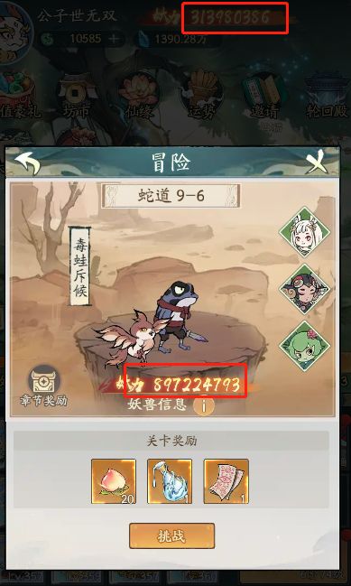 首先,减伤流就是在当前装备的基础上,追求极致的减伤,在当前版本仅有少数增伤属性和无视减伤属性的前提下,减伤流是独树一帜的存在,因为没法被克制,在推图中,尤为好用,比如在我妖力只有3E的情况下,已经能够推到9E+的关卡,而且它在我触发减伤条件后的情况下,只能强制打我1滴血量,配合恢复效果,基本无伤推图,只有我攻击力在规定回合数内,不足以击杀小怪的情况下,才会无法通关,如图: