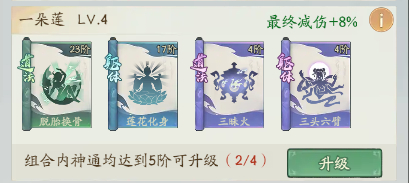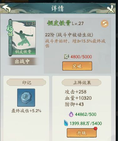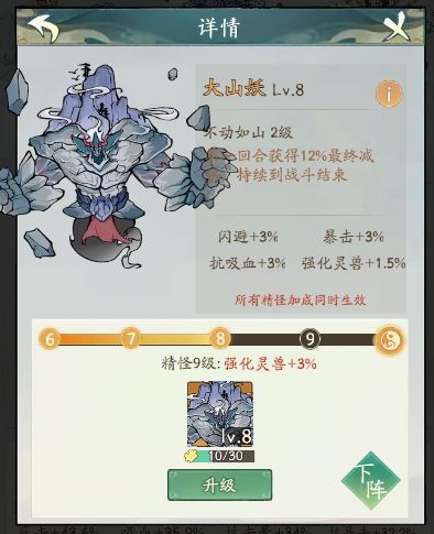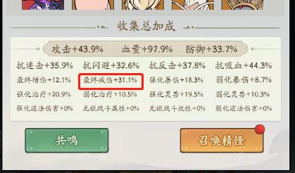 我们可以看到,这两个精怪都有大量的减伤,当前我的等级较低,两个精怪叠加的减伤能够达到53%,然后我们看神通