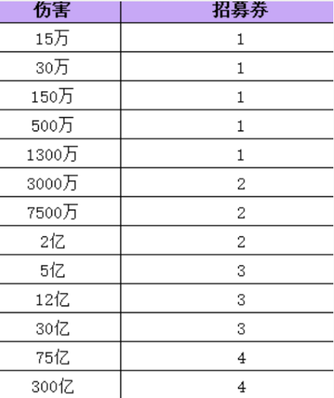 2、每个伤害都有不同的奖励,详细如下图所示获取招募券。