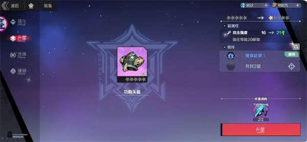 好了,重点来了,装备升星不要乱升,因为是不可以像经验继承一样返还的,分解也不会有,只会打水漂,所以这边建议大伙,蓝装备不要升星,紫装备看自己的推关情况,最多拉到两星,解锁紫装备的第二个羁绊栏加成就行哈,不要在往上拉了,有金装备就拉到四星,解锁第三个羁绊栏就OK啦,至于装备基础数值都是一样的,有金就拉金的星级,副词条反正可以重新洗练,不用担心评分问题。