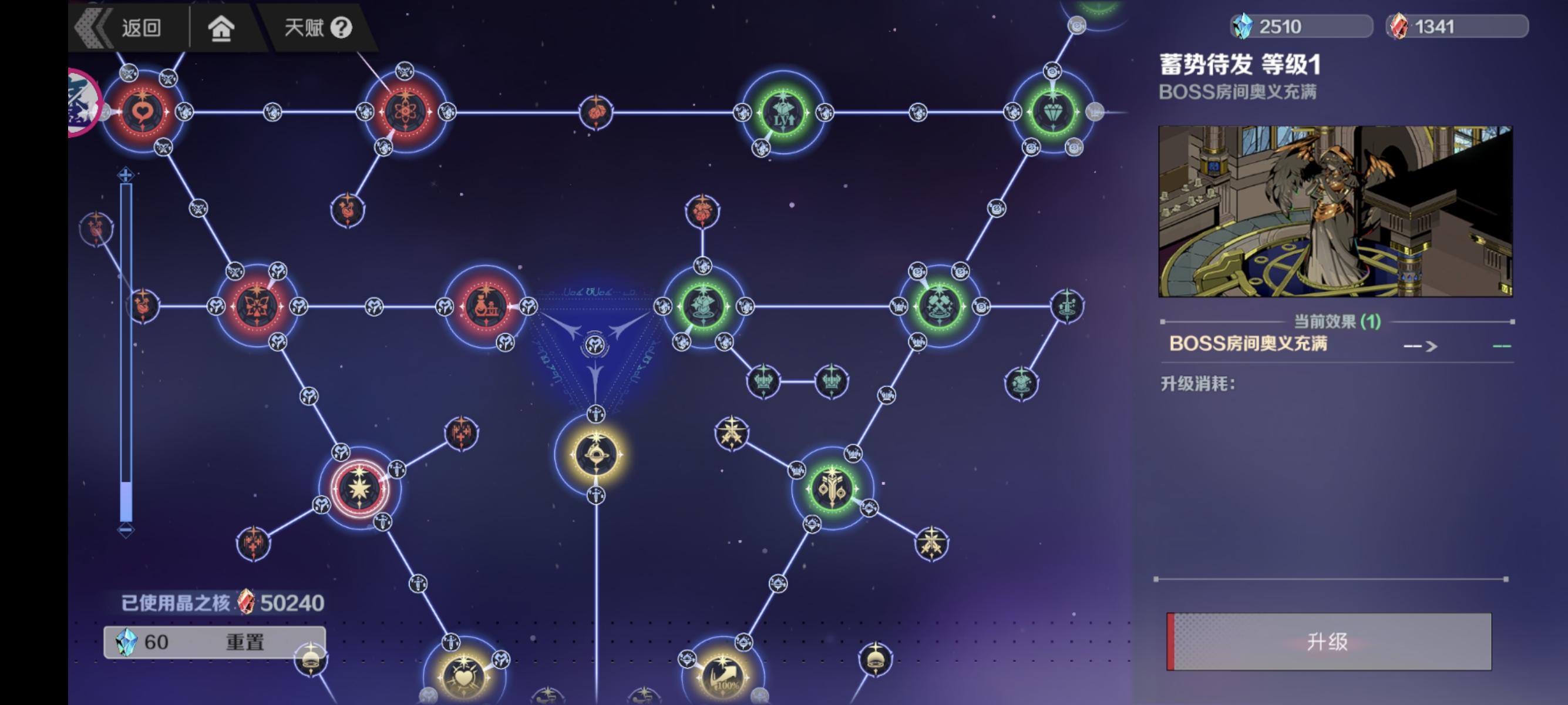 首先我们先来了解一下天赋系统的基本玩法,首先天赋系统共有三个类别,分别是绿色的局外功能区(右上)、红色的局内功能区(左上)、黄色的战斗天赋(下方)。