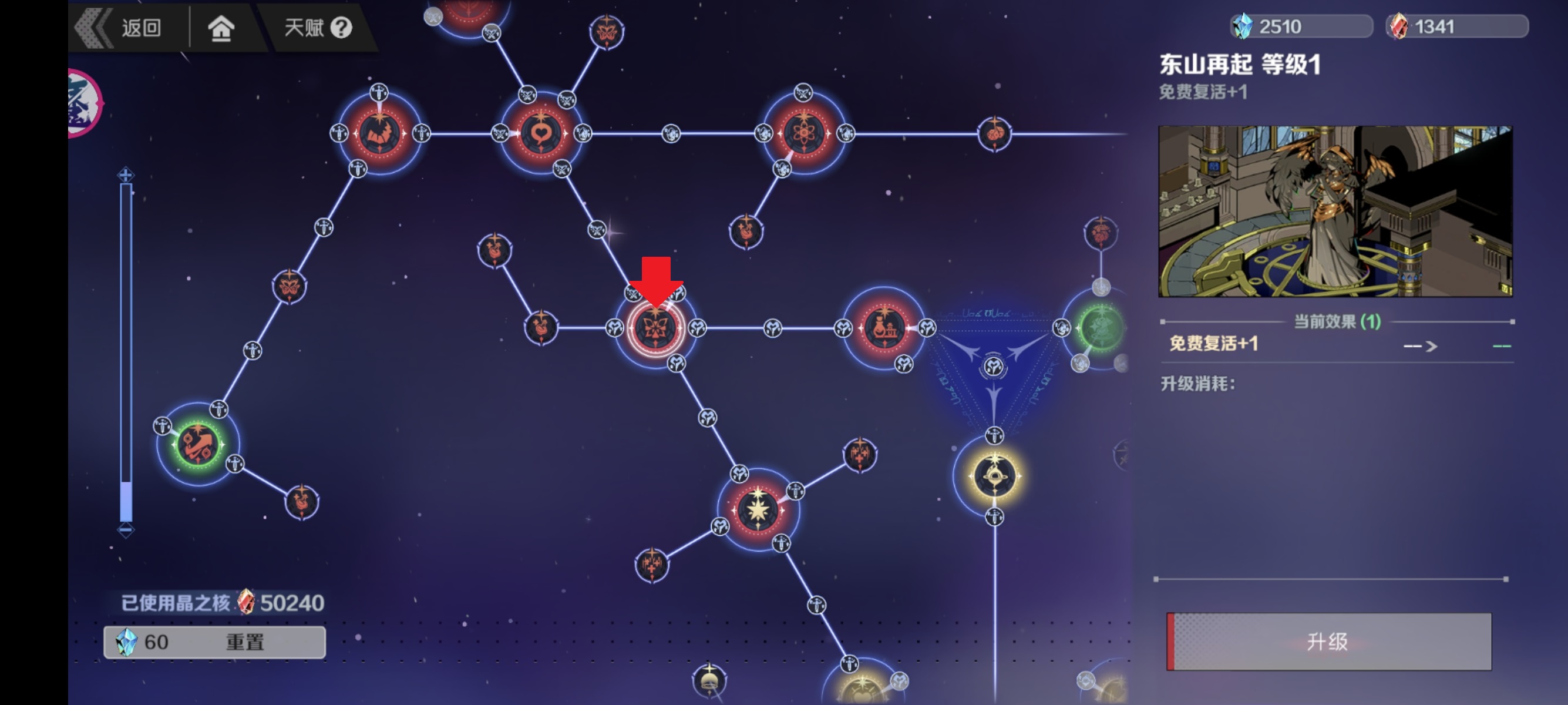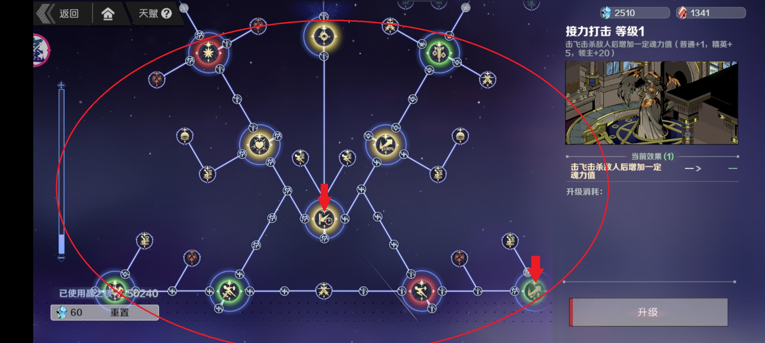 点完黑市天赋后,我们移步到左靠上的对局功能区,这一片的天赋基本是作用于我们每次对局内的功能增幅,我们优先选择点出免费复活-初始异能选择-魔器刷新-魂石刷新,以及附近的开局魂币自带增加小天赋,点完这些天赋之后可以增强我们在对局内的功能性,可以更快选到想要的法盘、魔器,提升巨大,期间如果前置要求不够可以点一些其他的小天赋。