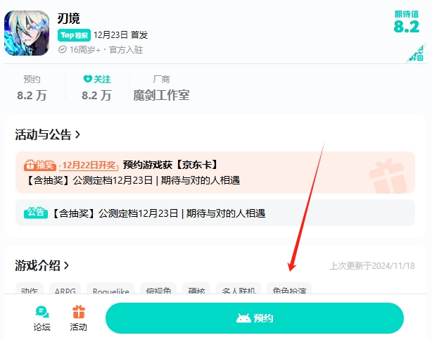 1、我们在TapTap上找到刃境游戏后,点击下方的预约按钮;