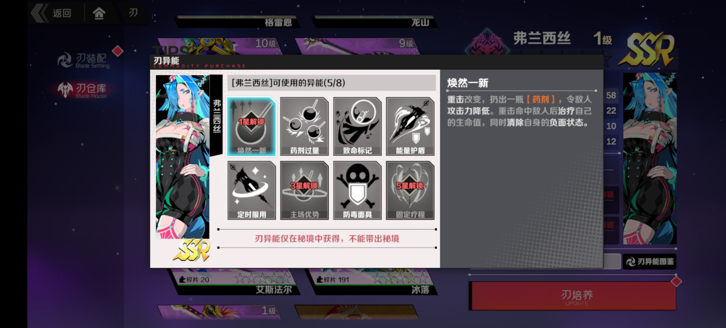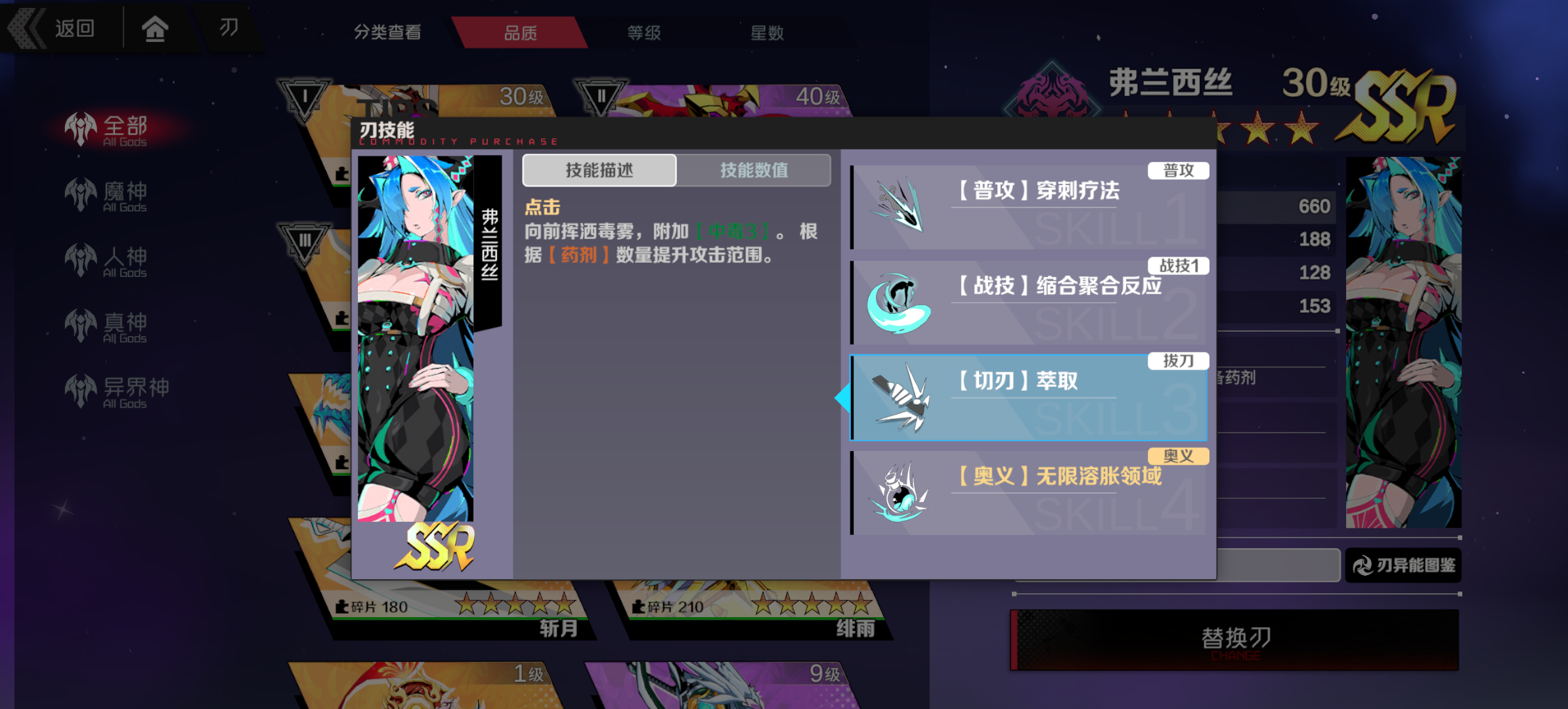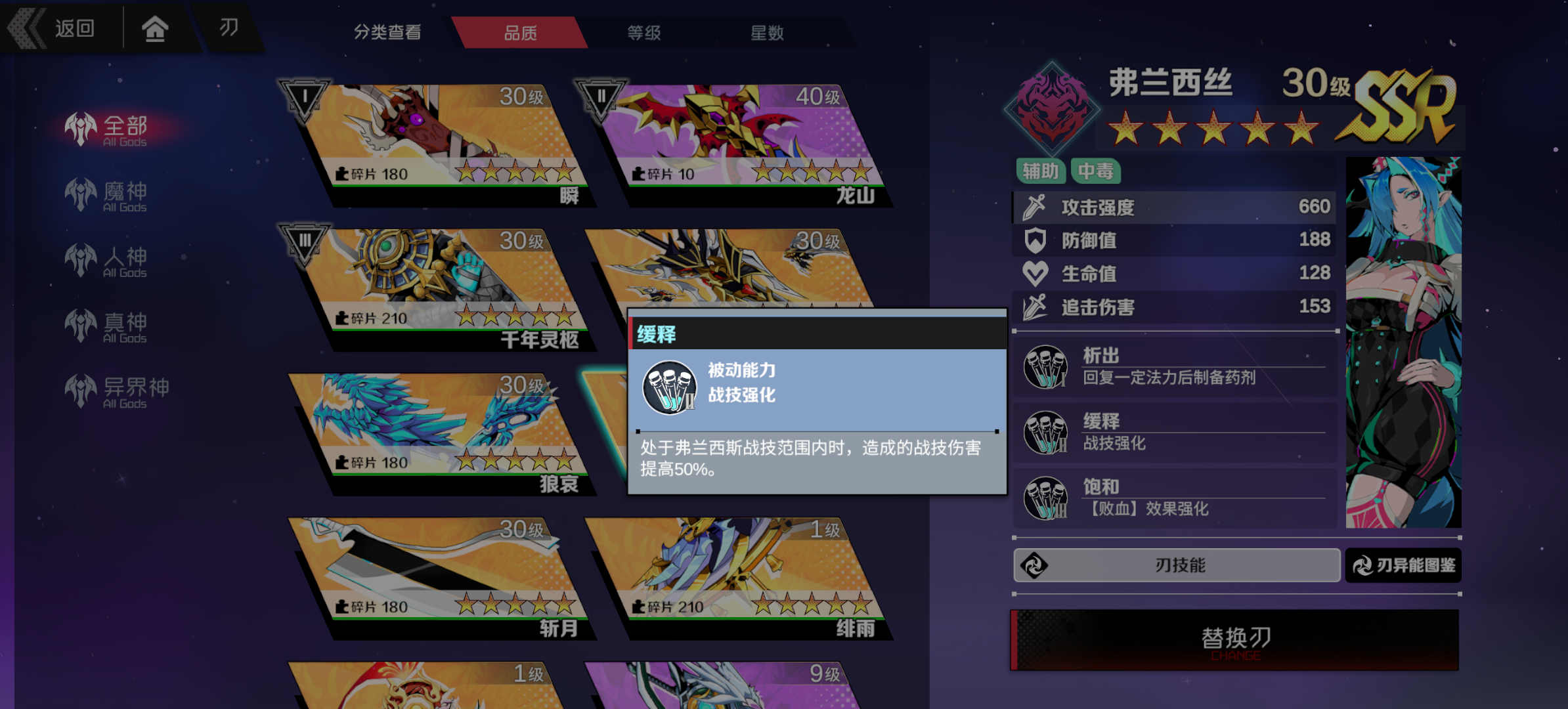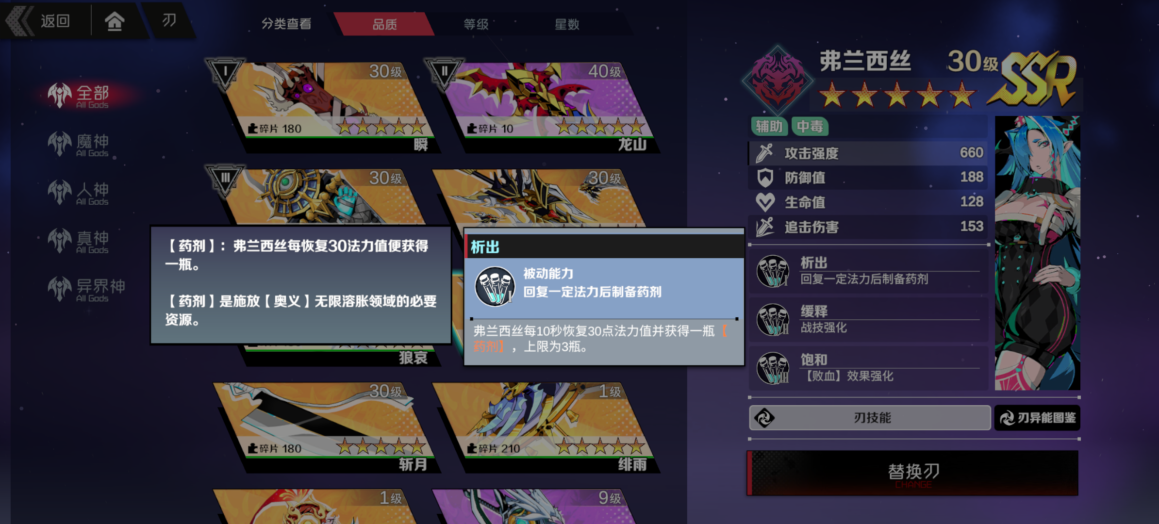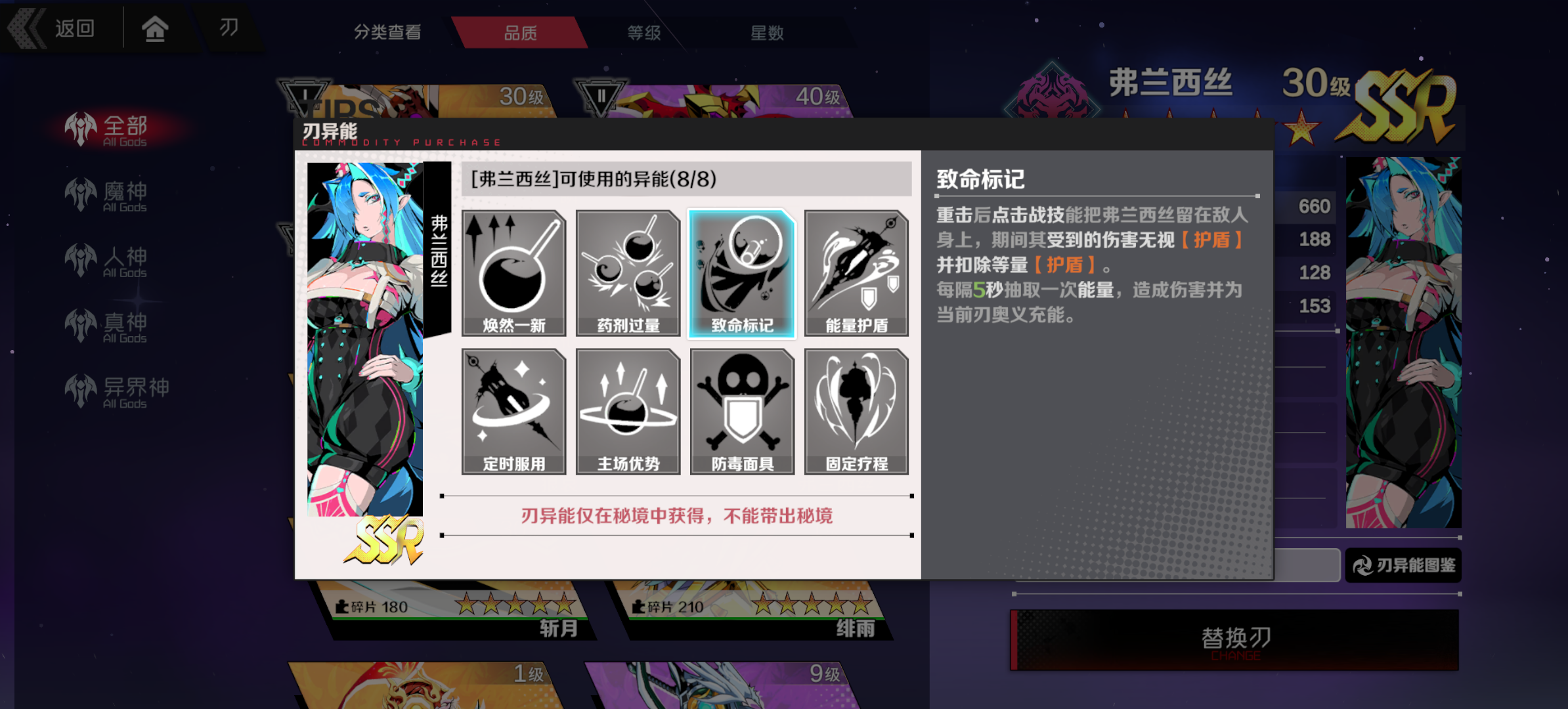 毒系辅助,护盾,破盾,易伤,增伤,回血应有尽有,高贵的30易伤和其它刃神配队也非常吃香
