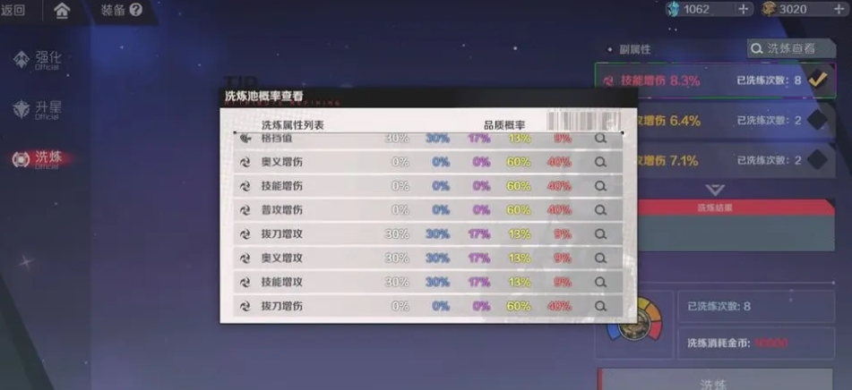 洗练系统大家要是注重的话,其实建议按照增攻>破坏值>增伤这样的顺序来提升效果,在图片右上角有一个洗练查看装备附带的可洗练词条的功能,通过这个功能可以看到大家的装备将洗出什么副属性,因此在前期可以通过普通深渊来刷出主属性为攻击力的装备,凑齐一些好的羁绊,需要注意的是,上位武器所需的强化材料远远高于中位武器,由于缺乏强化材料,强化等级较低的上位武器的攻击力可能还不如中位强化满的装备高,因此在换上位武器之前务必要特别注意这一点。