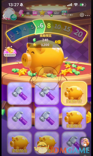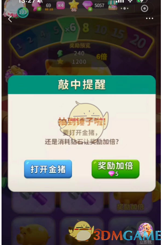 2、会随机转到锤子(可以选择用五个钻石继续翻倍,或是选择直接敲开金猪获取奖励)。