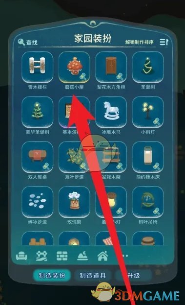 2、在家园建造玩法内,点击家园装扮,选择蘑菇小屋进行制造;