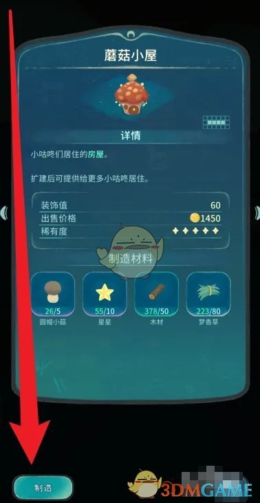 3、消耗圆帽小菇、星星、木材、梦香草,点击左侧的制造即可获得蘑菇小屋;