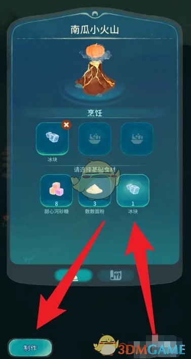 2、接着在南瓜小火山烹饪玩法中,选择冰块、面粉、砂糖进行制作;