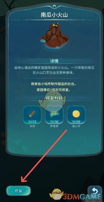 3、材料集齐之后,点击左下角的修复,等待南瓜小火山的修复;