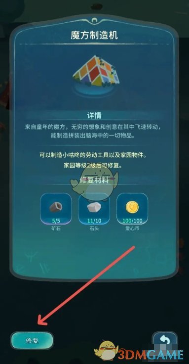 答:选择魔方制造机,消耗矿石、石头、爱心币即可完成修复。