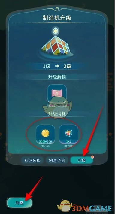 3、魔方制造机的升级材料是爱心币300、魔方格1,接着点击升级;