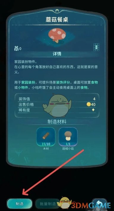 3、消耗木材和圆帽小菇点击制造,即可获得蘑菇餐桌;