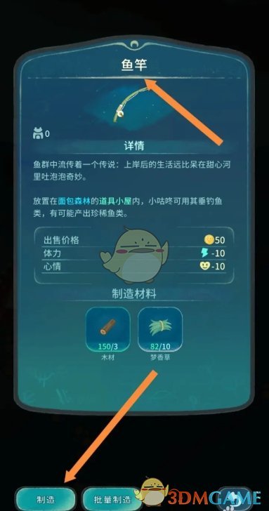 2、接着在建造玩法中,找到鱼竿,消耗材料进行制作;