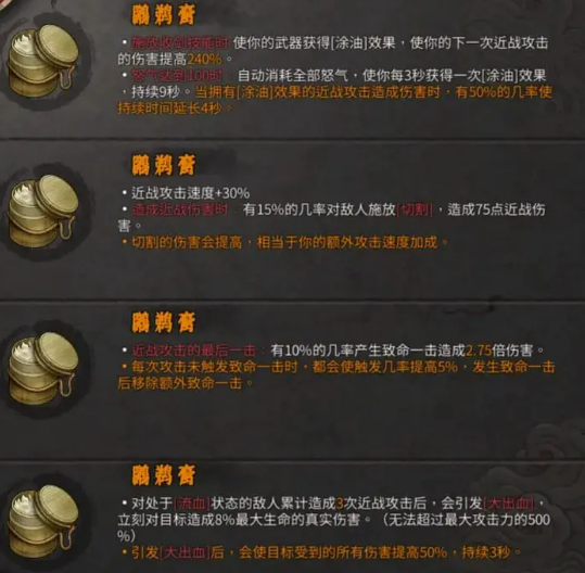 3、当拥有【涂油】效果的近战攻击造成伤害时,有50%的几率使持续时间延长4秒;