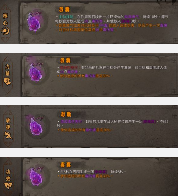 ①主动技能:在你周围召唤出一片环绕你的剧毒瘴气,持续10秒。瘴气每秒会对敌人造成X点毒伤害,并使敌人[中毒]3秒。