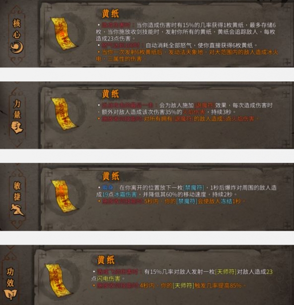 造成伤害时:当你造成伤害时有15%的几率获得1枚黄纸,最多存储6枚,当你施放收剑技能时,发射你所有的黄纸,黄纸会追踪敌人,每枚造成?/?/?点伤害