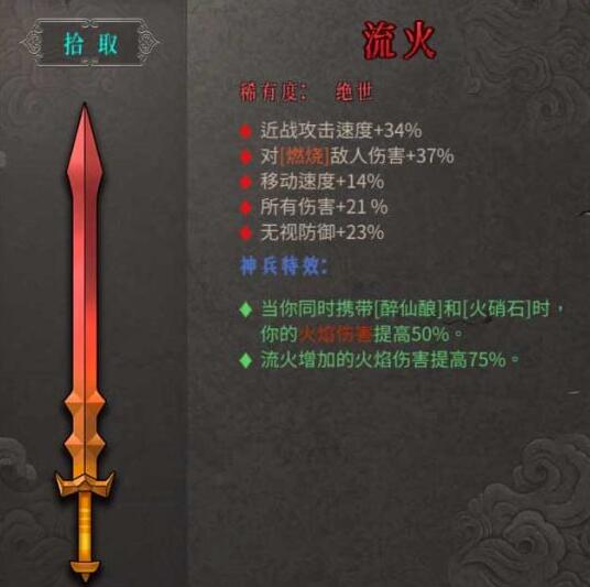 ·当你同时携带[醉仙酿]和[火硝石]时,你的火焰伤害提高50%。