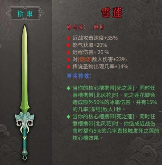 ·当你的核心槽携带[死之莲],同时任意槽携带[北风花]时,死之莲花瓣会造成额外50%的冰霜伤害,并有15%的几率[冻结]敌人1秒。