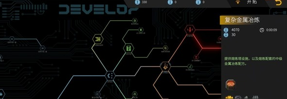 2、 钢材需要研究科技复杂金属冶炼,复杂金属冶炼前面还有一个前置科技乘积迭代,完成上面的材料收集,玩家就可以建造贸易站了。