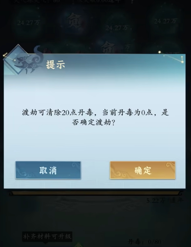 而要想将丹毒降下来,除了等时间让丹毒自行消退外,人们还可用祛毒丹来进行清除,只是祛毒丹非常难获得,因而不能作为常用条件。而在渡劫时,由于渡劫会降低20的丹毒,所以最好先把丹毒控制在20,这样等渡劫后丹毒就全清空了。