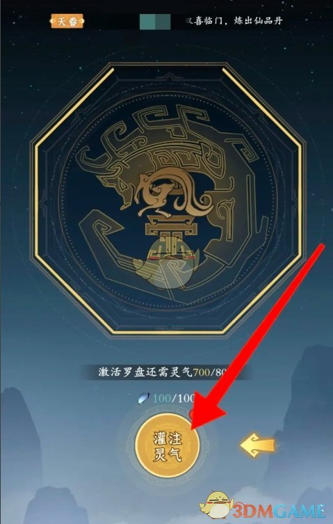 3、前往神秘罗盘页面后,点击下方的灌注灵气,就能给罗盘灌注灵气了。