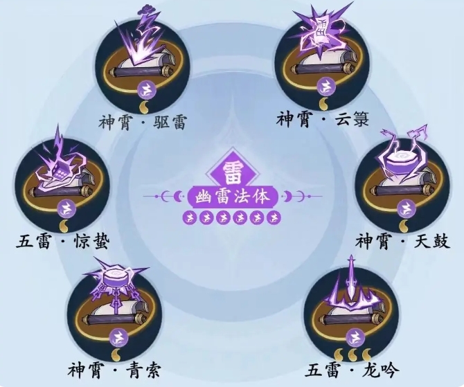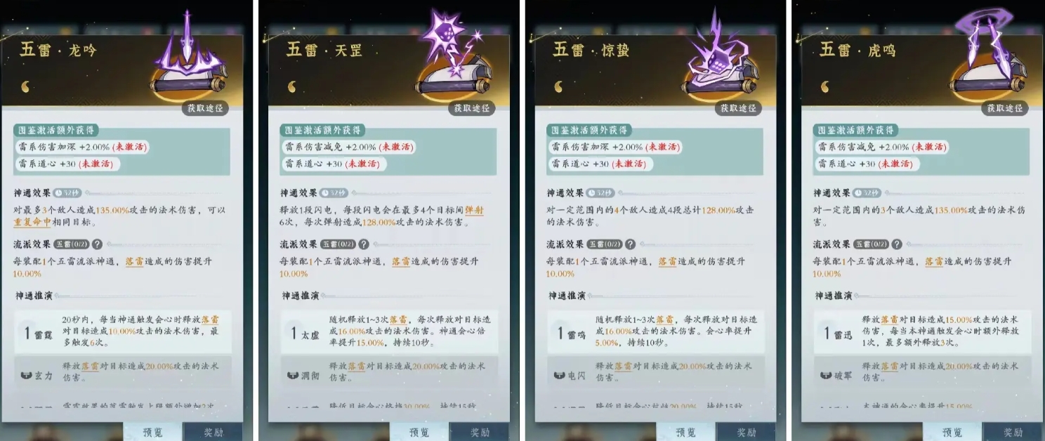 雷修派系中又分为两个流派五雷与神霄,五雷流特点在于落雷与多段弹射闪电带来的法术伤害,核心神通是五雷·龙吟,因为它能够为流派提供稳定的伤害输出,也正是五雷流的高会心触发落雷来源,为了进一步增强五雷流的落雷伤害,推荐搭配的神通有五雷·天罡、五雷·惊蛰和五雷·虎鸣,这些技能不仅能提升落雷的伤害,还能增加多段弹射闪电的效果,使得五雷流在战斗中更加具有更强的输出,通过合理配置这些招式,雷修玩家后期的输出也会慢慢呈现出来。
