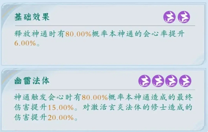雷修的核心在于暴击率的提升,所以搭配的神通有这方面加成的话,就可以让雷修玩家能够在短时间内给敌人造成大量伤害,每一招出手都特效炸裂,带来一招制敌的快感,当雷修派系装备四个雷系神通后,可以激活幽雷法体,激活幽雷法体后,在神通触发会心时,有80%的概率使本神通造成的伤害提高15%,这意味着堆高会心值能够在战斗中打出更高的伤害。