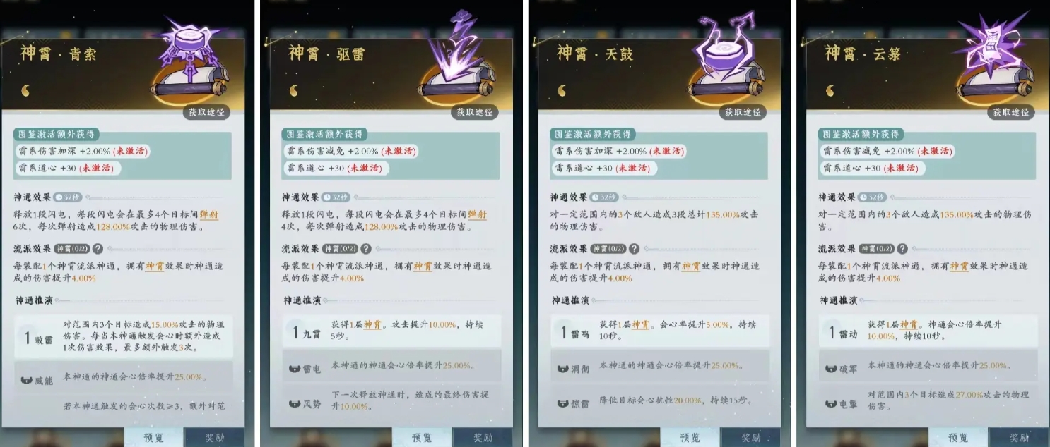 神通效果会对最多3个敌人遗成135.00%攻击的法术伤害,可以重复命中相同目标,释放1段闪电,每段闪电会在最多4个目标间弹射6次,每次弹射造成128.00%攻击的法术伤害,对一定范围内的4个敌人造成4段总计128.00%攻击的法术伤害,最后一个神通是对一定范围内的3个敌人造成135.00%攻击的法术伤害,神通达成雷鸣之后,会随机释放1~3次落雷,每次释放对目标造成16.100%攻击的法术伤害,会心率提升1雷鸣5.00%,持续10秒时间。