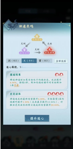 心法就是被动效果会提升你的属性,分为神威:提升攻击和命中,金甲:提升防御和闪避,长生:提升生命和会心抗性,融灵:提升真元和会心。每个功法提升的侧重点不一样,推荐大家优先提升神威和融灵。