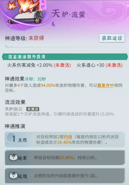天炉流派的战术倾向于利用“灼烧引爆”的方式,来产生强烈的物理伤害爆发。与离火流派的持续压制战术不同,天炉流派以其频繁且覆盖广泛区域的爆炸性清除能力为特点。玩家在装备天炉系列的神通后,每额外装备一个这样的神通,就能让燃烧引爆的伤害提升15%,这极大地增强了其输出效率。在核心神通的选择上,天炉·陨火是不可或缺的,它作为天炉流派的核心技能,能够召唤火流星从天而降,瞬间点燃并引爆目标区域,成为快速清理战场的绝佳手段。