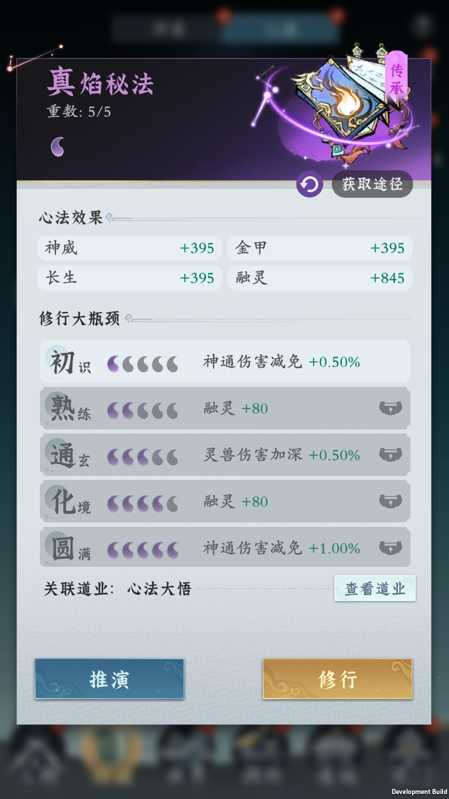 3.感悟:推演和养成所使用的心法真意、心法精义和心法感悟,都可以通过感悟获得。