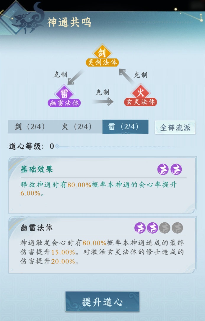 当仙长装备两个雷系神通后即可激活基础效果,装备四个雷系神通后即可激活幽雷法体幽雷法体激活后可以有概率提升神通造成的最终伤害,最重要的是,幽雷法体克制玄炎法体,当遇到玄炎法体的修士时,造成的伤害提升20%!