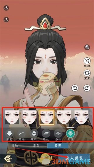3、选择好身世后,进入捏脸系统,总共有面部、下巴、眉毛、眼睛、瞳孔、眼睑、鼻子、嘴巴,还可以设置妆容和发型;
