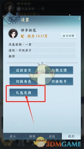 3、然后打开游戏设置页面,点击下方的礼包兑换功能,进入兑换详情页;