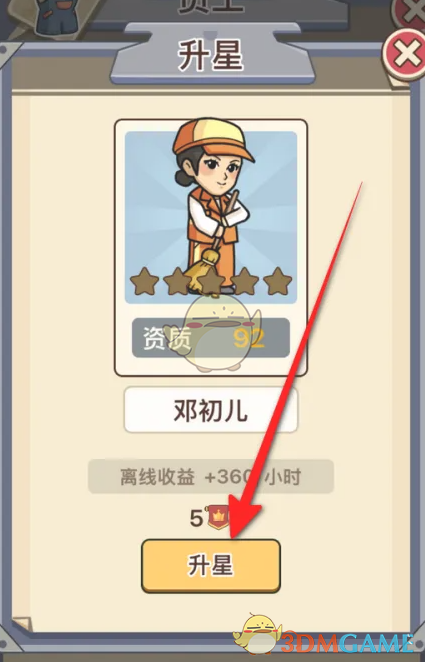 3、触发升星弹框,进入到对应员工的升星页面,点击下方的升星图标,消费5个升星徽章即可。
