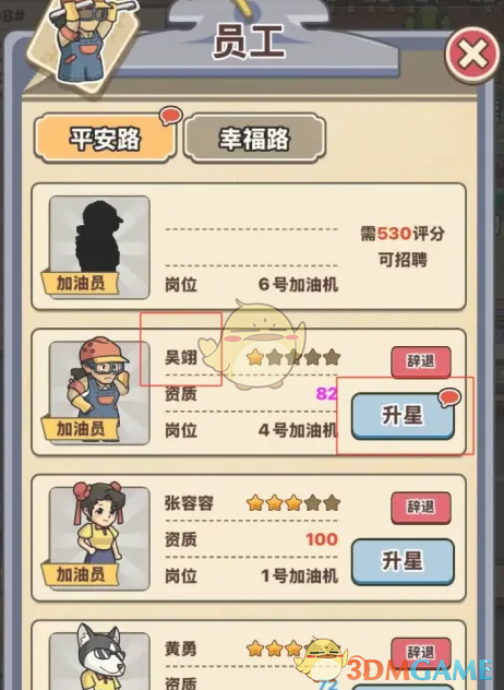 2、在员工页面找到加油站的加油员-吴翔,点击后面的升星按钮。
