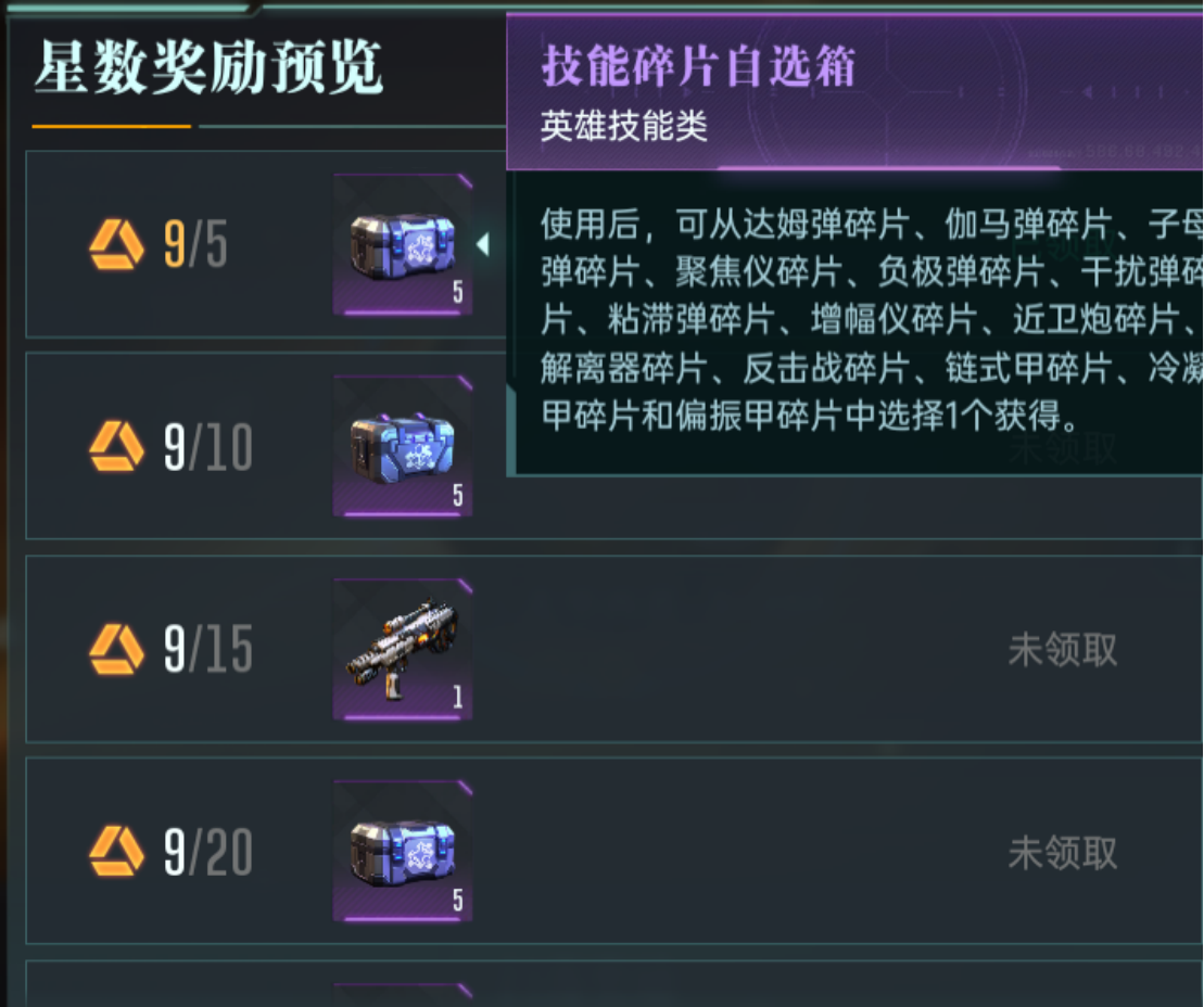 达成星数还可奖励一次性的技能碎片、英雄碎片、装备等