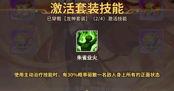 两件套名称:朱雀业火使用主动治疗技能时,有30%概率驱散一名敌人身上所有的正面状态